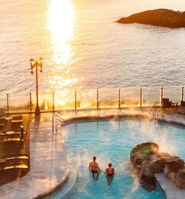 Mineral pools above the water, sunset dining, and a touch of occasion nearby.